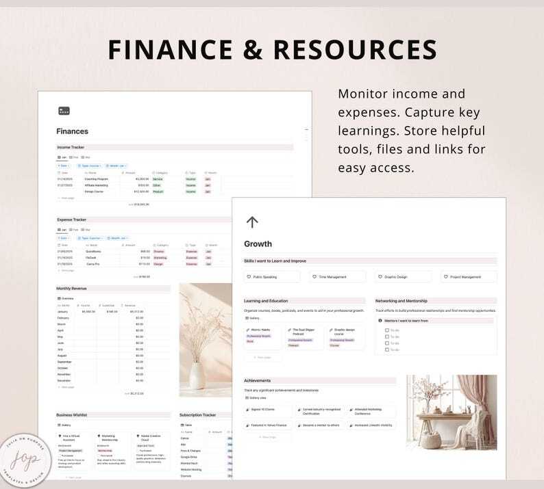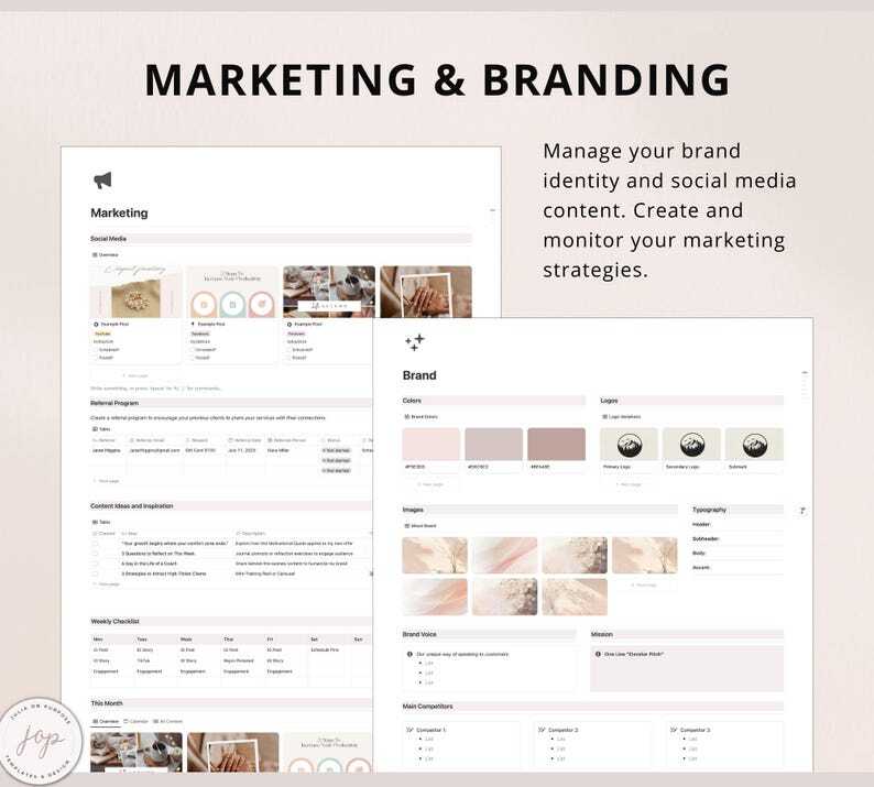 This Notion business planner helps entrepreneurs, freelancers, and small business owners manage every aspect of their work – from social media content to finances – all in one place.