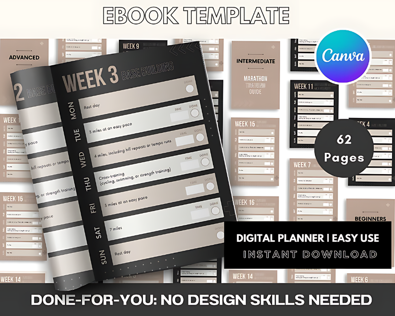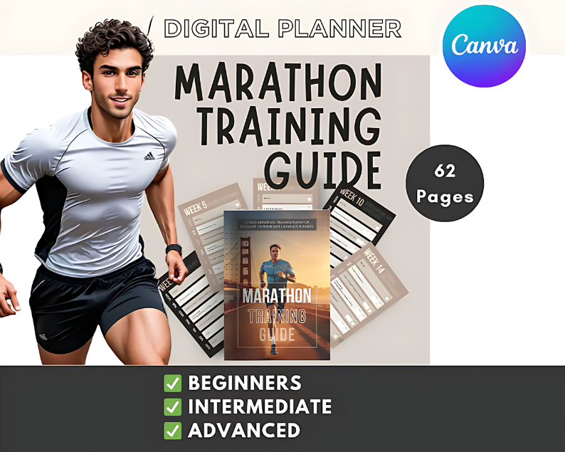 Running & Marathon Planner: Your Trusty Companion for Your Running Goals | Editable Canva Template. Packed with expert advice, personalized tips, and actionable strategies, it's the ultimate resource to help you stay the course and achieve your marathon goals.